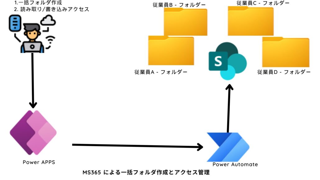 Power Apps と Power Automate を使用すると、SharePoint 上に多数のフォルダを作成し、アクセスを一括管理できます。