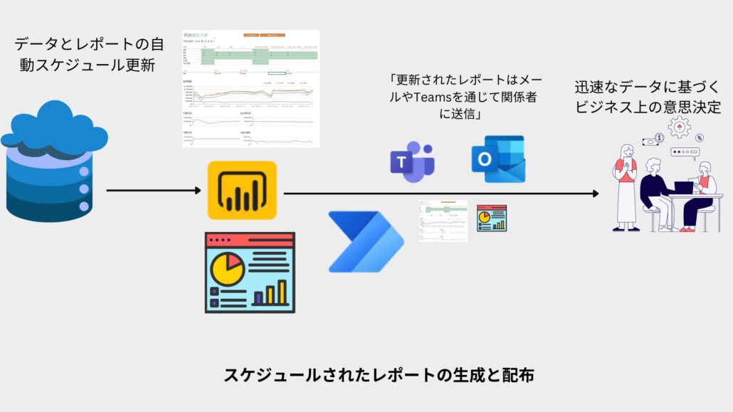Power BI は、データ視覚化レポートの作成と共有のために MS365 内で利用できる主要なサービスの 1 つです。Power Automate を使用すると、売上、経費、Web などに関連するさまざまなレポートを毎日、毎週、または任意のスケジュールで更新し、電子メールまたはチーム経由で関係者に共有できます。そのため、この自動化は、迅速かつ情報に基づいたビジネス上の意思決定に役立ちます。