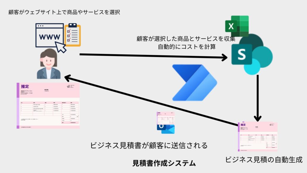 Power Automate で顧客が選択した製品やサービスを収集し、自動的にコストをを算出見積を作成し、顧客に送付します。