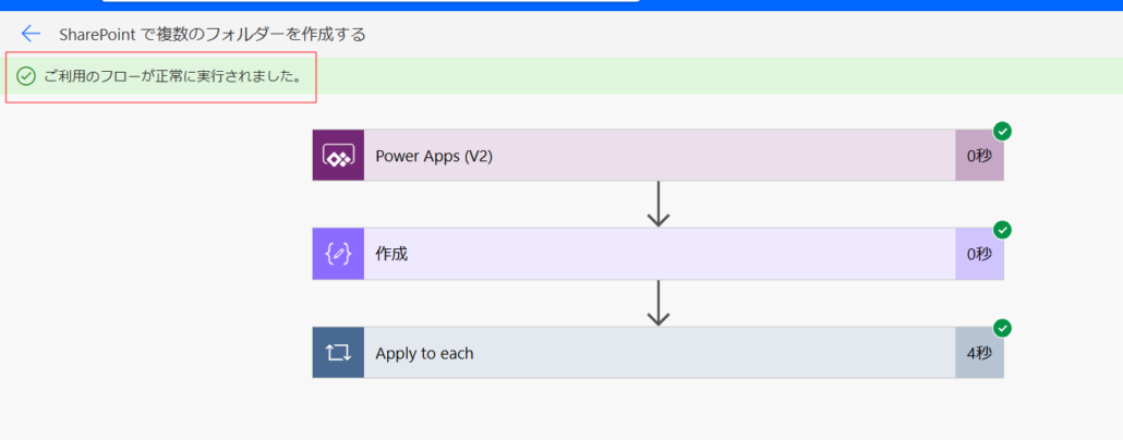 フローがエラーなく正常に実行されたことが、以下の図に示されています。