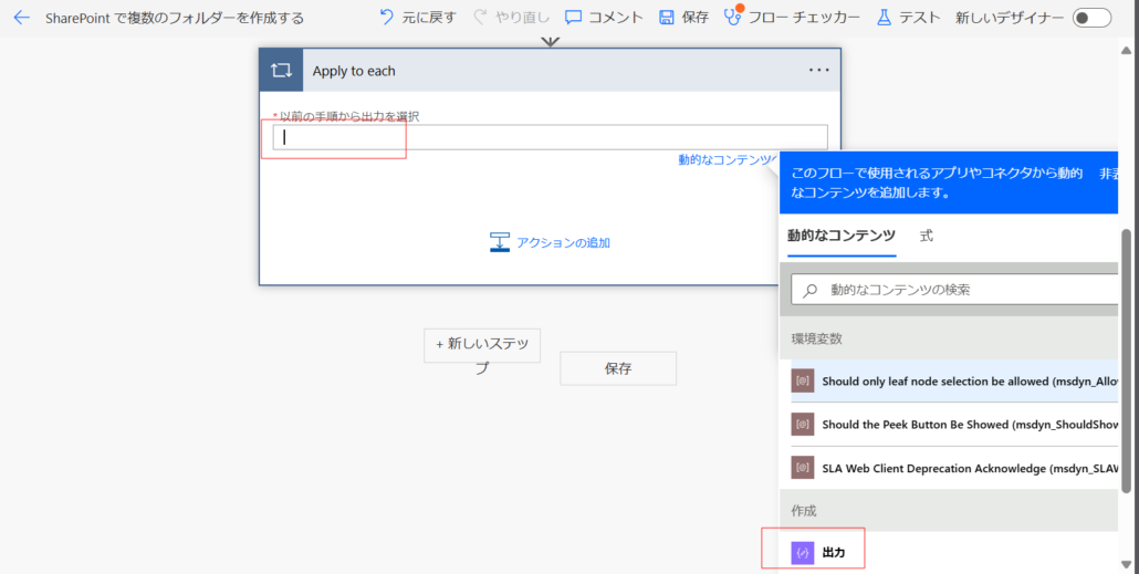 (i). フローの 「作成」 の出力を使用して、「Apply to each」ループ を設定します。