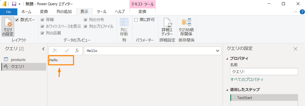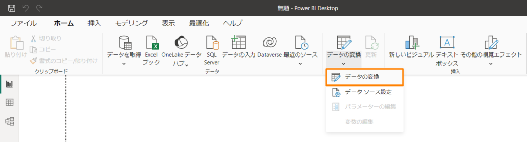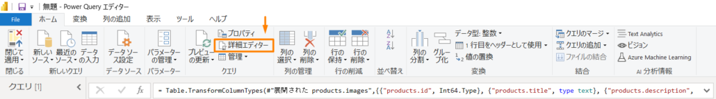 M コードは Power Query エディタで確認できます。 リボンで [データの変換] をクリックすると Power Query エディターが表示されます。