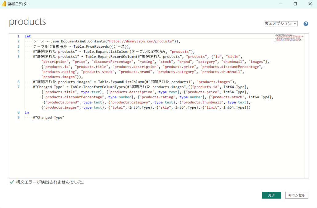 上記のコードを詳細エディターに貼り付けて、[完了]を押すと結果が表示されます。