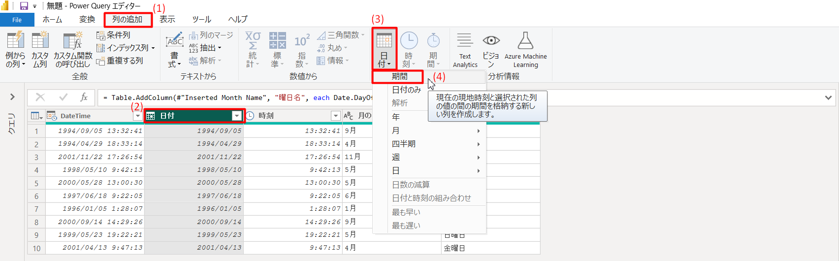 (1)「列の追加」タブ > (2)「日付」列を選択 > (3)日付 >(4)期間