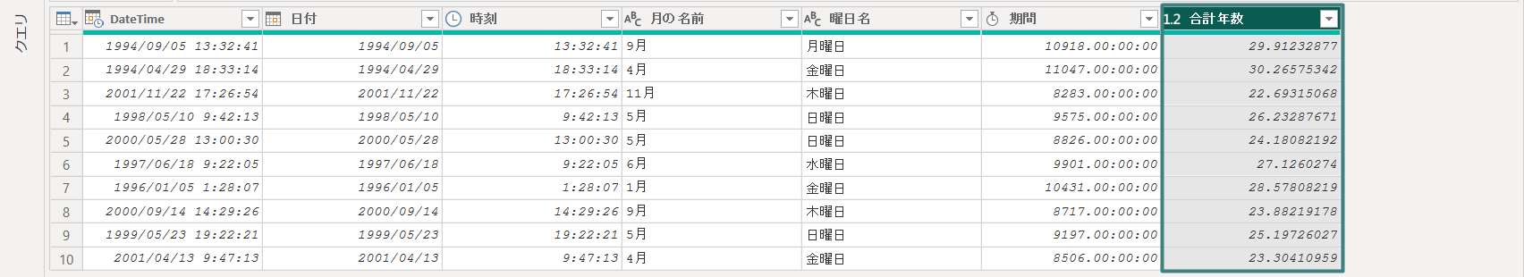結果は「合計年数」列が出力されます。しかし、年数がまだ四捨五入されていません。変換が必要です。
