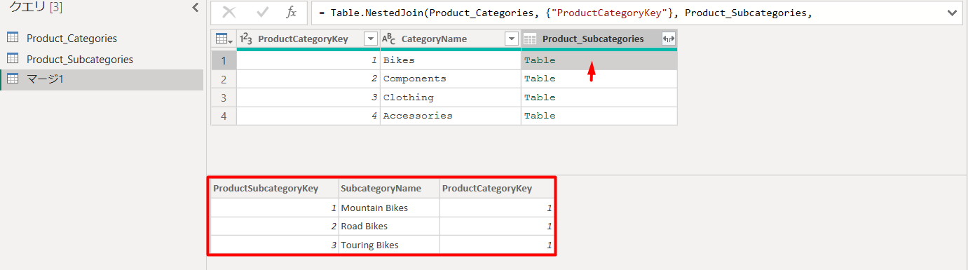 次に、「Product_Subcategories」 列 を展開してデータ分析手順を実行できます。