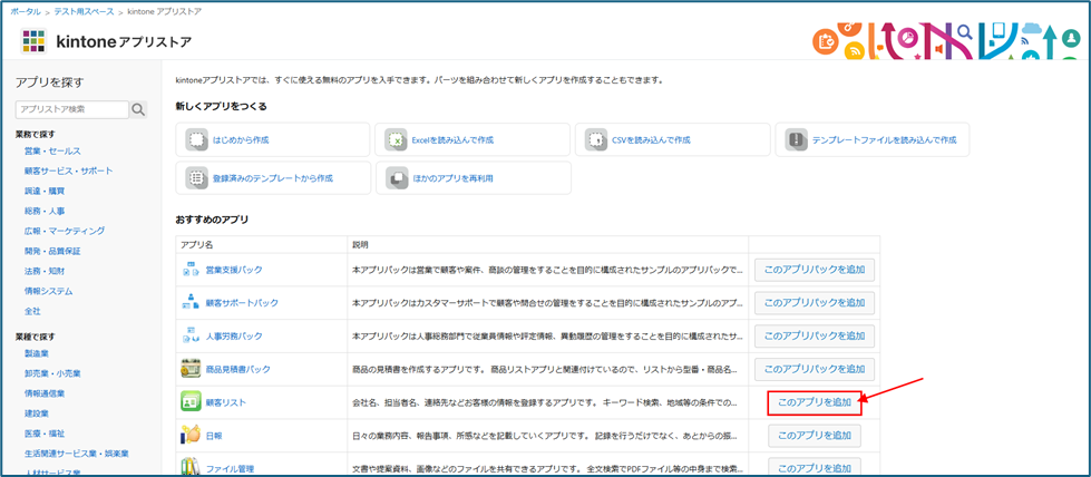 「kintoneアプリストア」にあるサンプルアプリ「顧客リスト」を使用します。