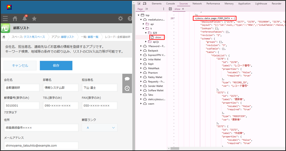そこで、kintoneの「Source」タブにあるリソースファイルを調査し、フィールドコードのIDを含むソースコードを発見しました。