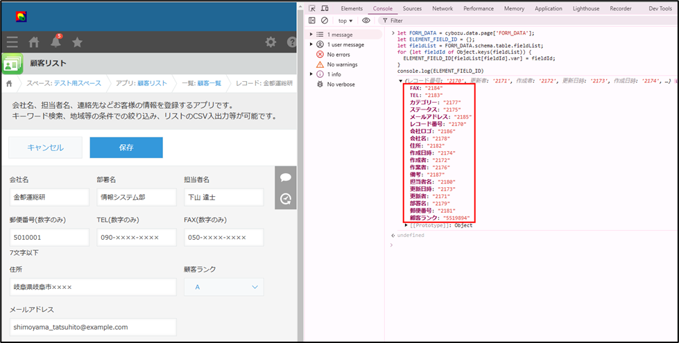 cybozu.data.page['FORM_DATA'] のデータには不要な情報が含まれているため、フィールドコードと対応するIDを抽出するための簡単なコードを書きました。