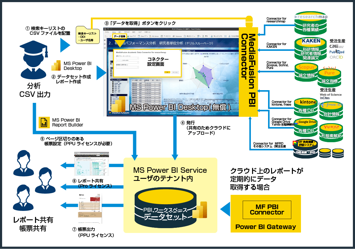 MF教員業績管理システムのオンラインPower BI連携機能の他、Power BIと各種外部サイトとオンライン接続するカスタムコネクターを提供しています(MediaFusionPBI Connector)。この技術を応用すると組織内の各種業務システムなどからデータを取り込むことも可能になります。また、一般業務向けにkintoneやGoogleDrive、会計システム用のコネクター等も開発しています。