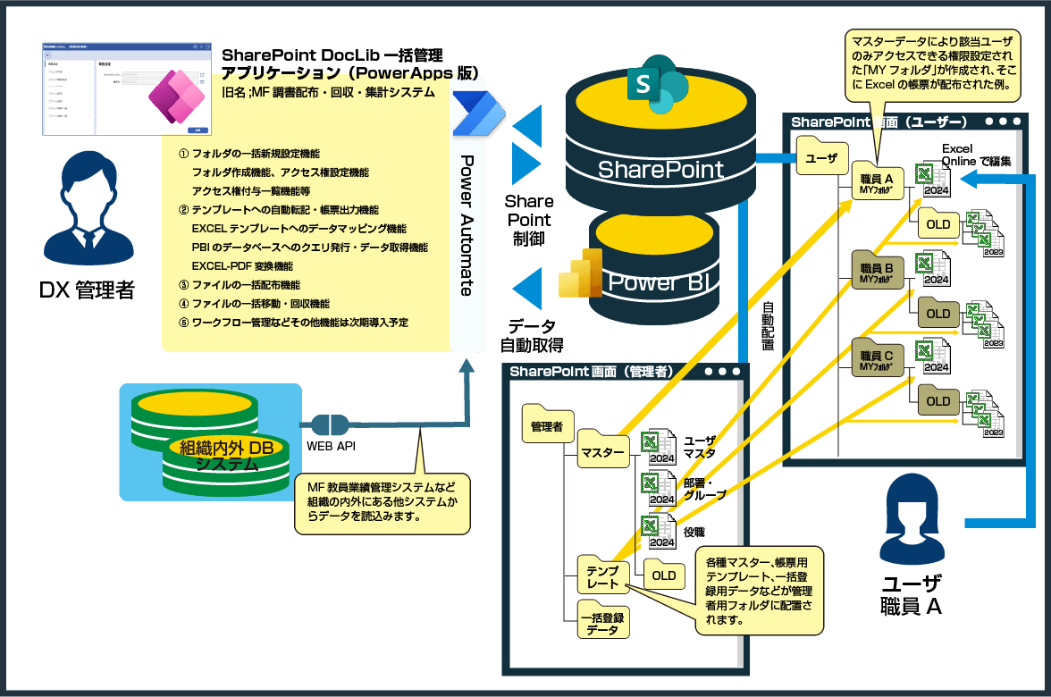 MS365によるDXシステムを構築するにあたり、SharePointにデータを蓄積する場合、SharePointにフォルダ作成、アクセス権設定、ファイル配置など多数の設定が必要になります。この大量の設定作業を支援するのが、「SharePoint DocLib一括管理アプリケーション」です。MS365によるDXシステム構築の要のアプリです。