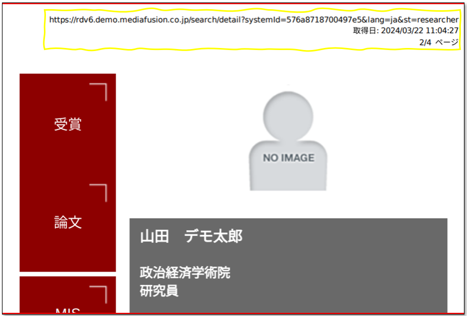 Web魚拓機能で研究者の公開画面を出力した結果例