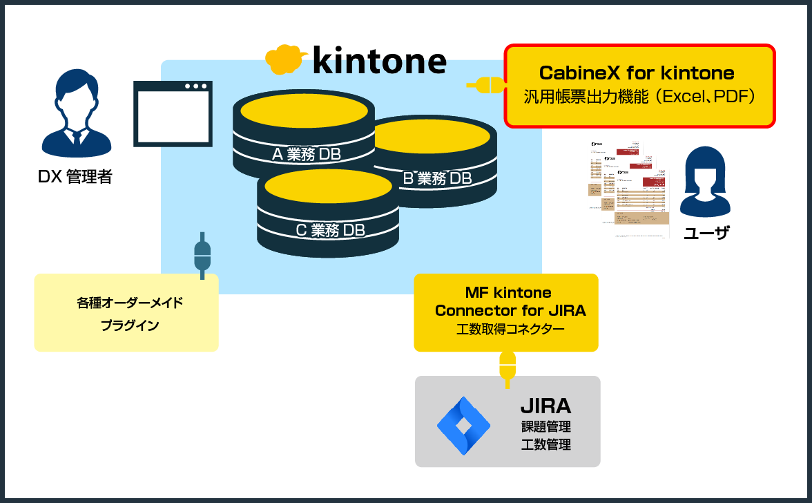 kintoneとPower BIなどの接続コネクターやDX化を推進する帳票出力等各種プラグインを提供