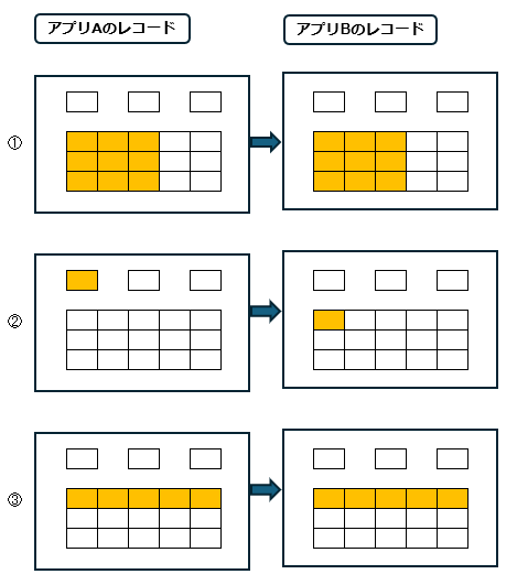 ③ アプリAのサブテーブルのレコード(先)→ アプリBのサブテーブルのレコード(元)